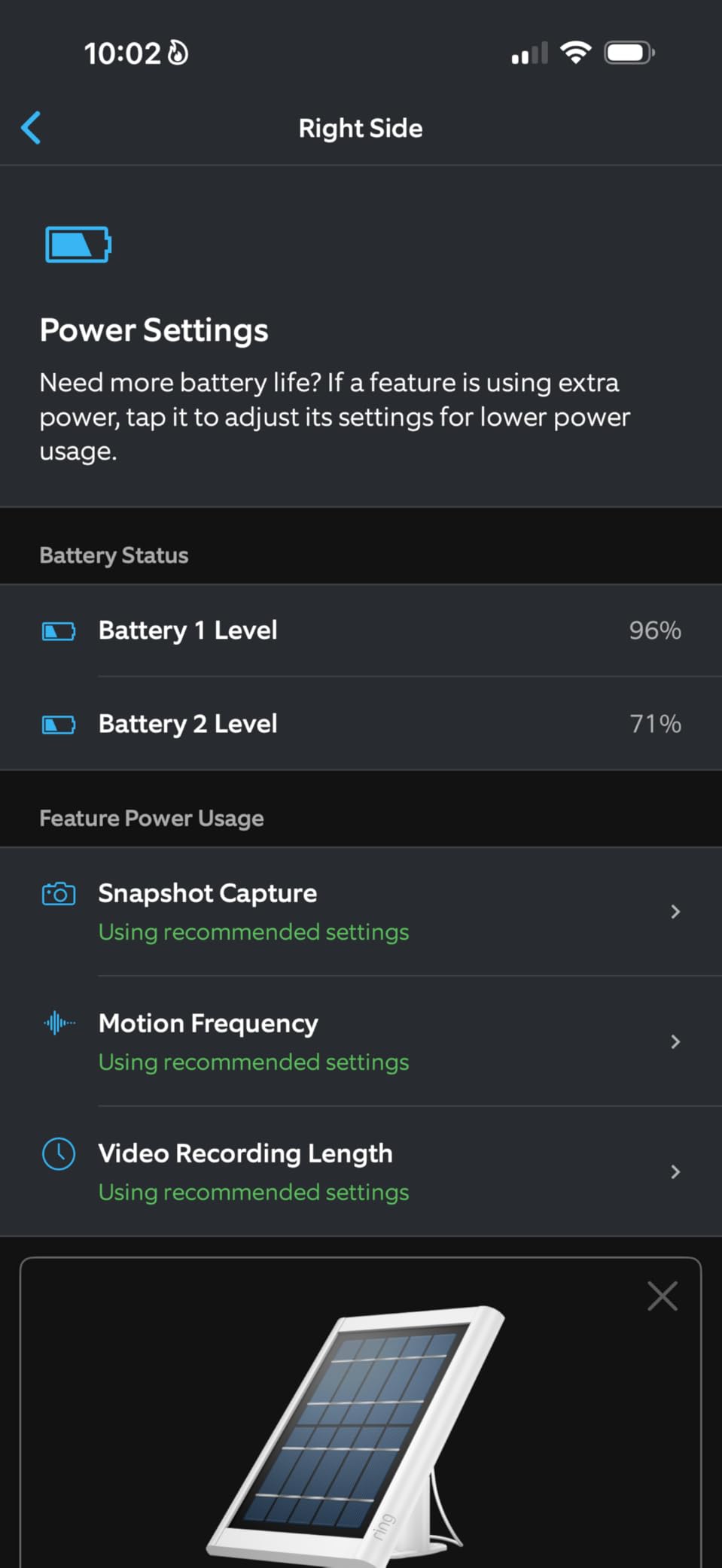 I have reseated the connector several times and made sure to turn it in the opposite direction in the event that there was a poor connection on one side of the USB-C, but not the other. I have reset the camera to factory defaults and let it download the firmware updates. I have been on the phone with Ring Customer support in the past. All of this to no avail. Generally, my batteries will last about a week before I need to charge them manually. Personally I believe it’s a firmware issue, but of course there’s no way to know for sure. This camera is in a remote location with no electricity available to plug it in, which is why I rely on batteries and solar. The picture I uploaded shows one battery at 74% with the other battery not installed (removed to charge). It also does not show any indication that the solar panel is plugged in, which of course it is. It’s a sunny day right now and the panel should be getting quite a bit of direct sunlight and this picture was taken during that time.